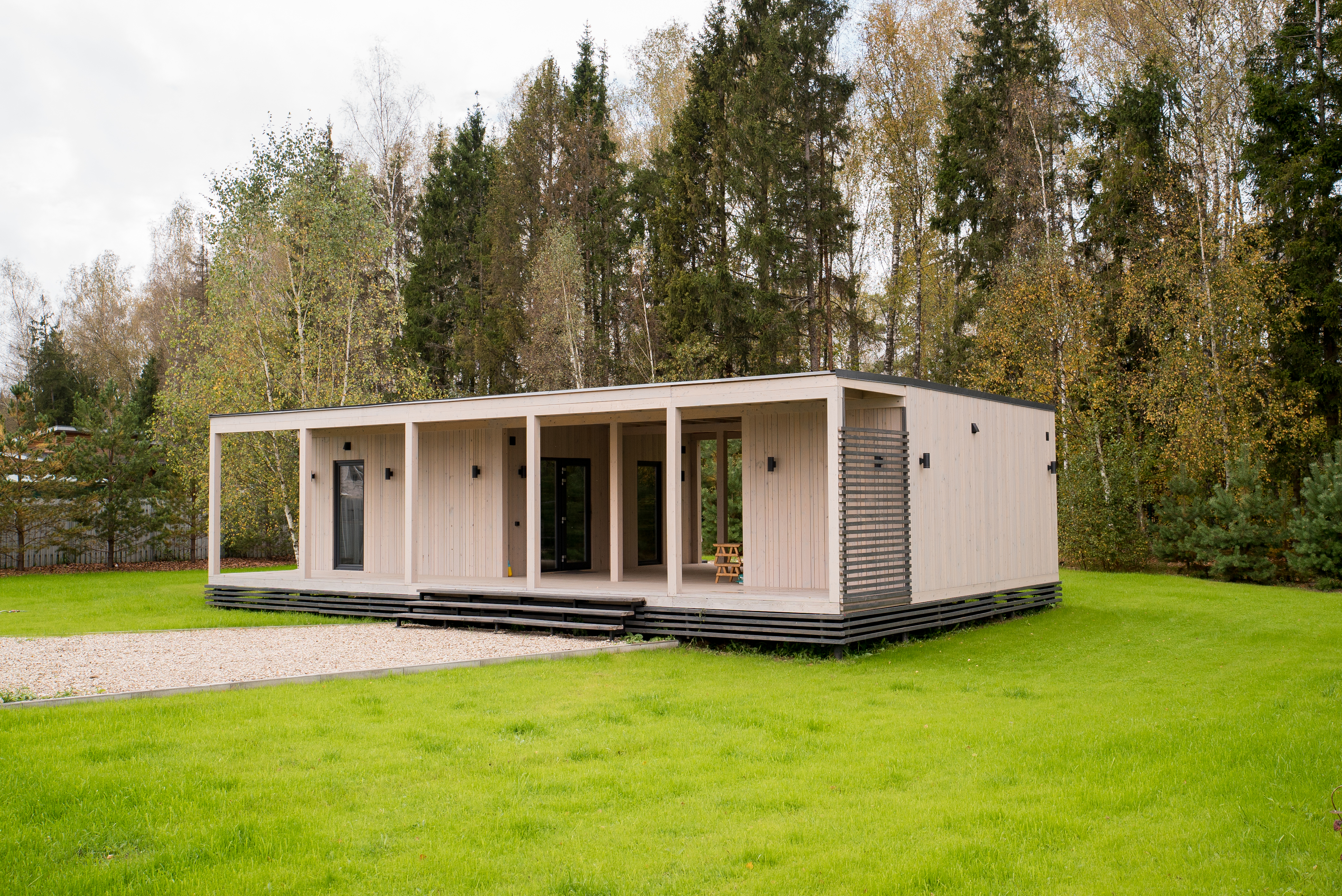 В доме — светлая гостиная, полностью оборудованная кухня и отдельная спальня. Также просторная терраса, переходящая в сауну. На участке в 10 соток есть мангальная зона и парковка для авто.